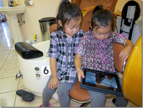 Once Ro and Ree were all fancied up, the tiny stylist chairs were the perfect perch to watch a little iPad movie and wait for mama to get beautiful. Please excuse the aforementioned drowned-rat hair. I didn’t have a comb in the car, so they got finger-scraped-back tails.